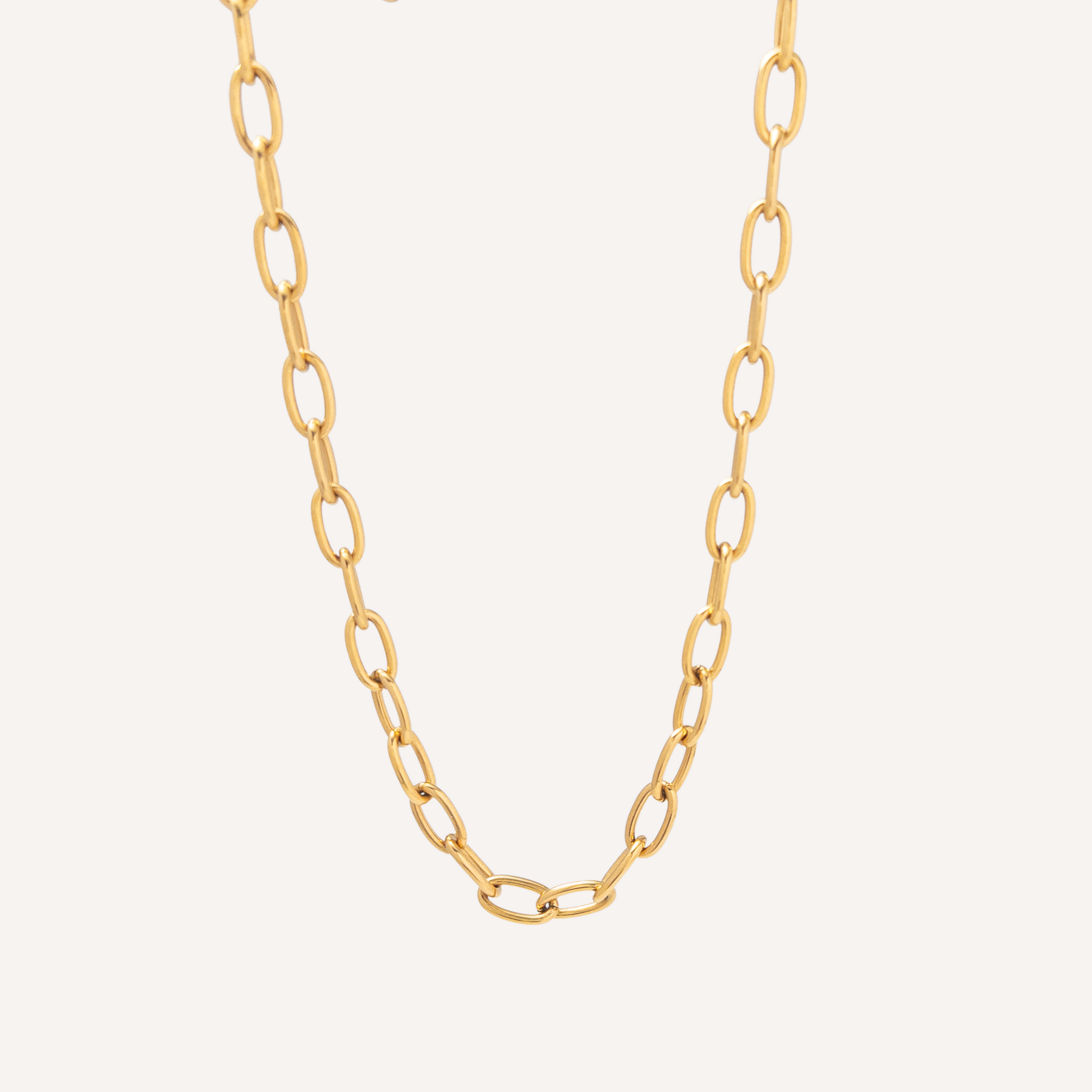 A statement with this eye-catching gold-plated oval link chain necklace. Its chunky design offers a perfect balance of elegance and edginess, suitable for both casual and dressy occasions.