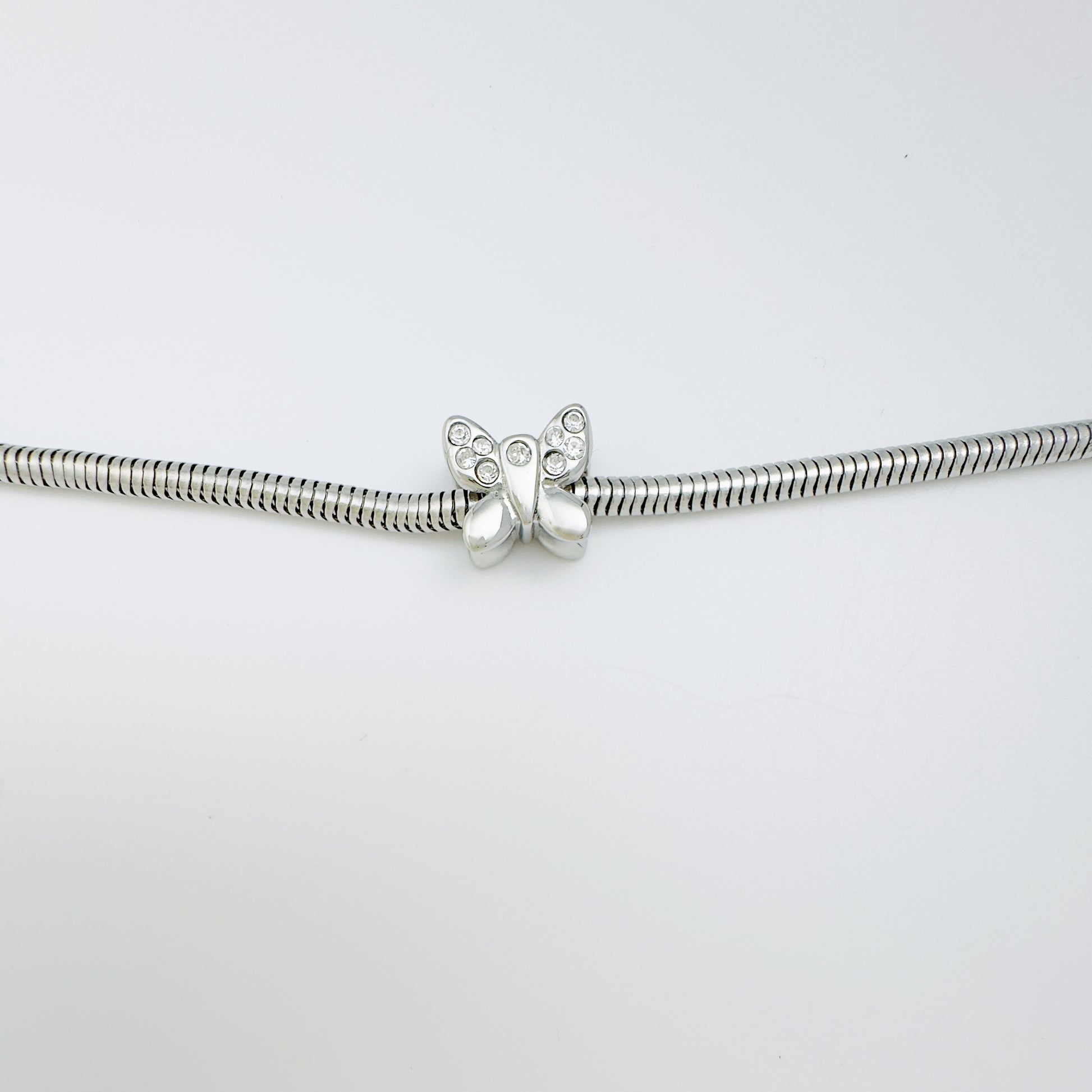 This elegant butterfly charm is designed for snake chain bracelets. Featuring a polished finish and sparkling cubic zirconia stones across its wings, it adds a touch of brilliance. It’s a perfect, subtle accent.