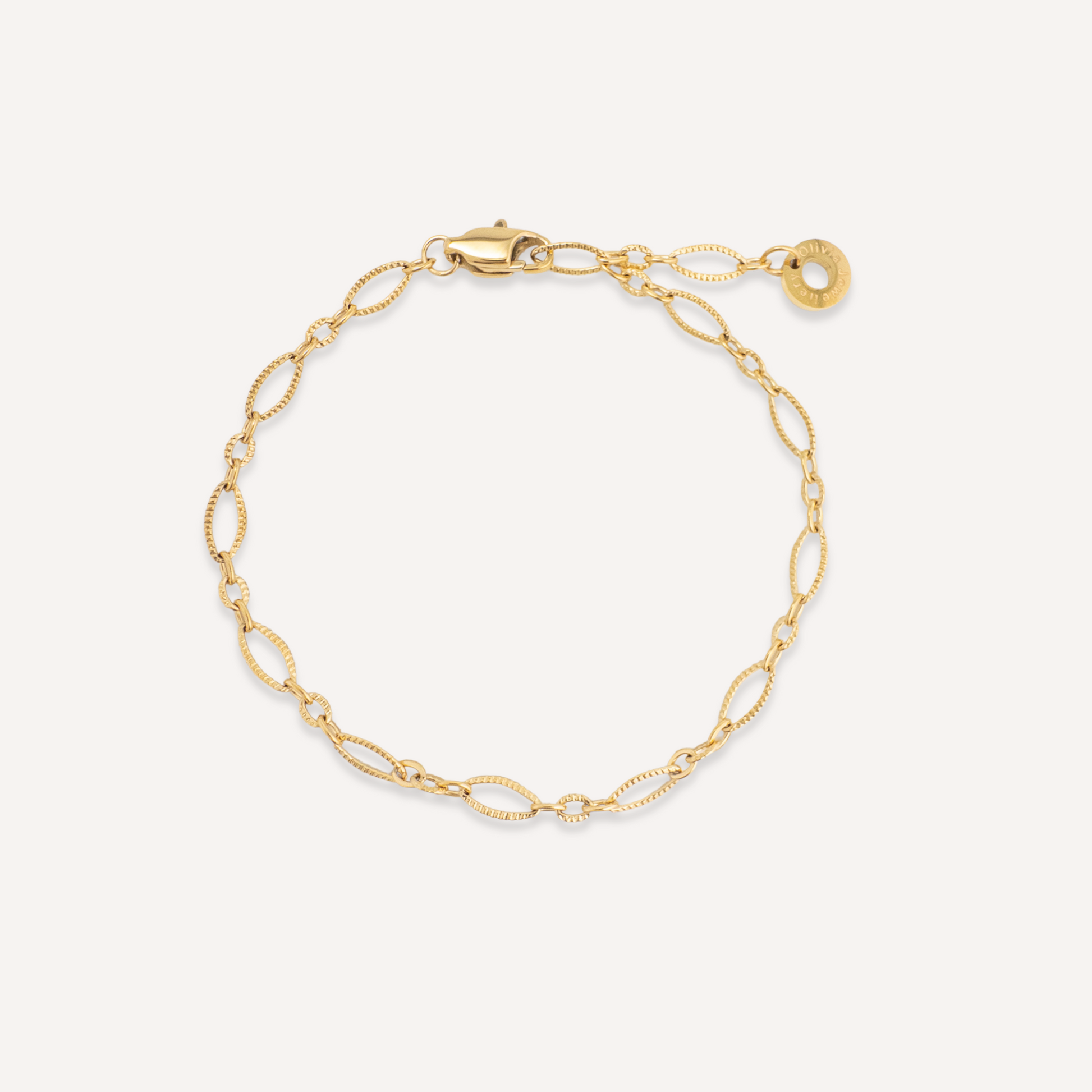 This elegant gold bracelet features a delicate chain of textured oval links, creating a graceful and feminine look. Waterproof and adorned with a small charm, it's perfect for everyday wear or layering with other pieces.