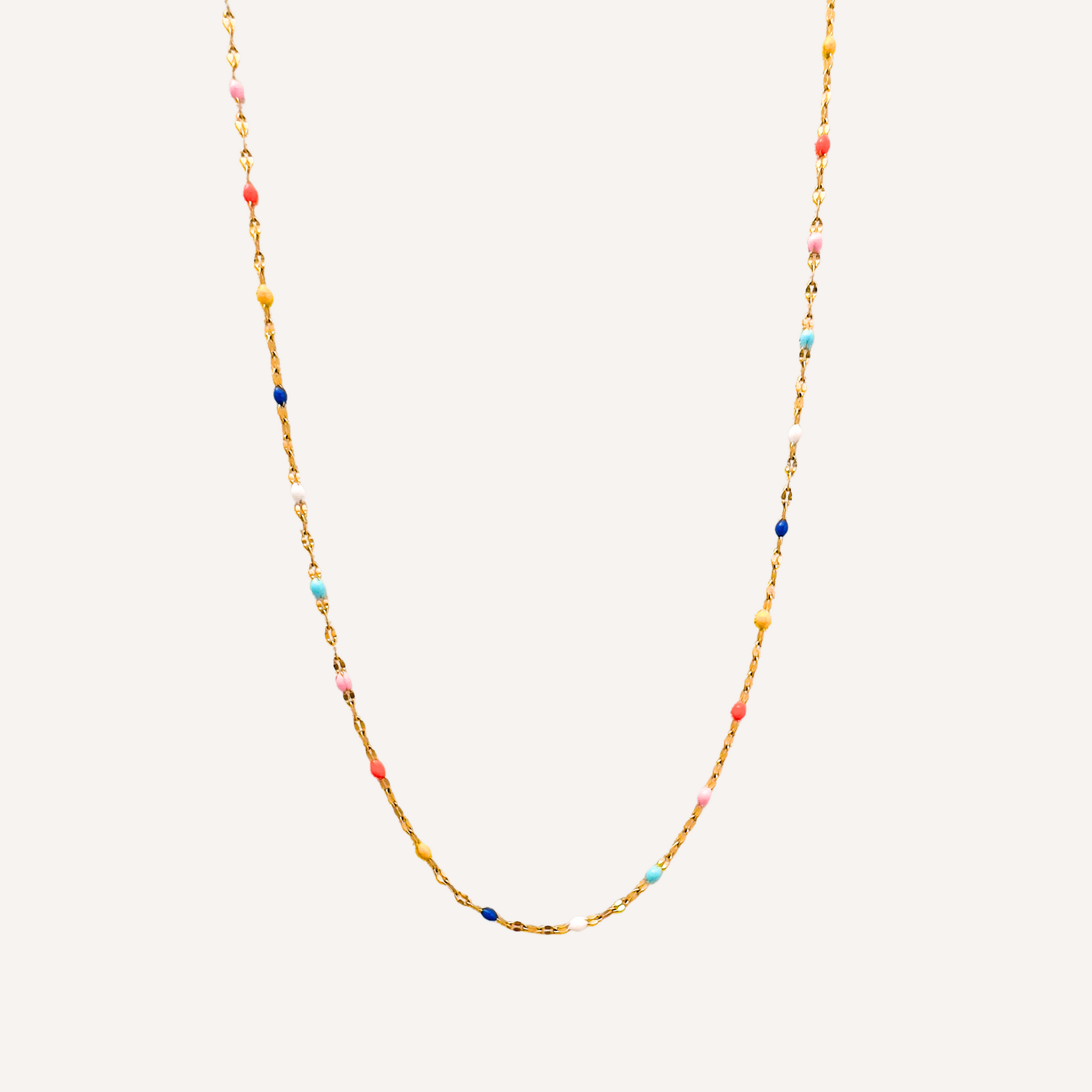 This dainty gold necklace features a stunning array of colourful beads, creating a subtle rainbow effect. Waterproof and lightweight, it's the perfect accessory for adding a pop of colour to any outfit.