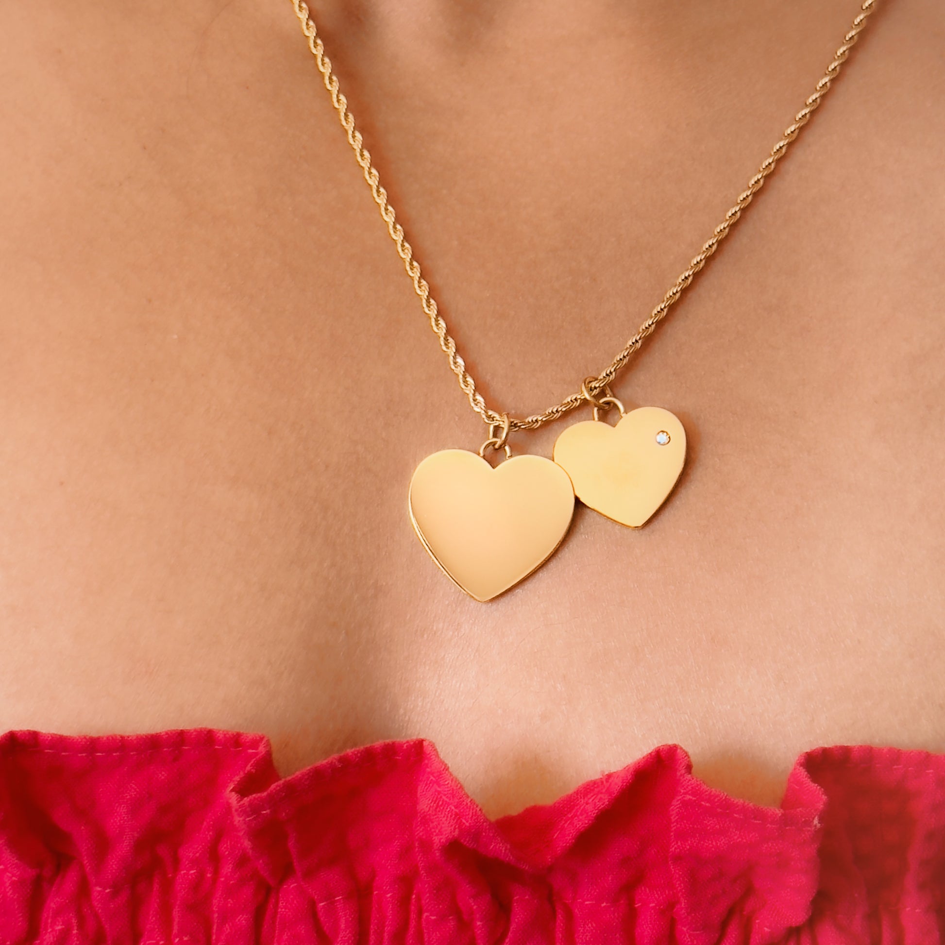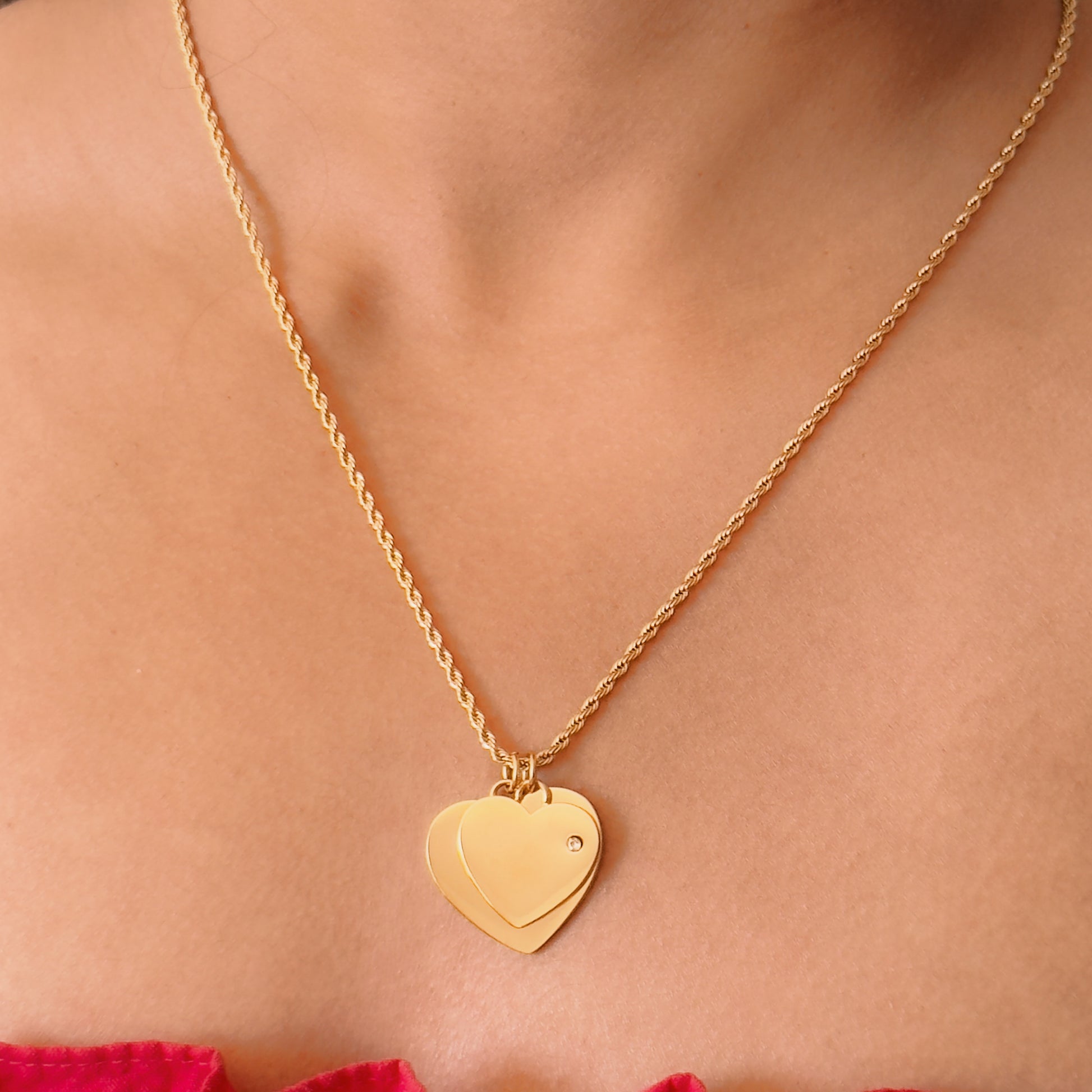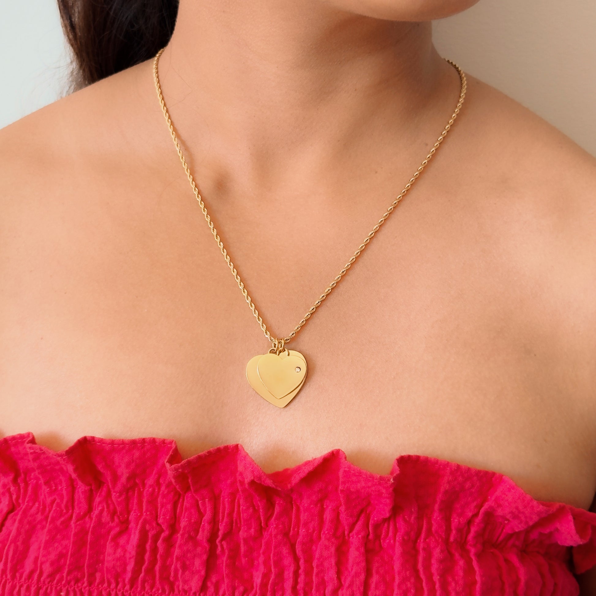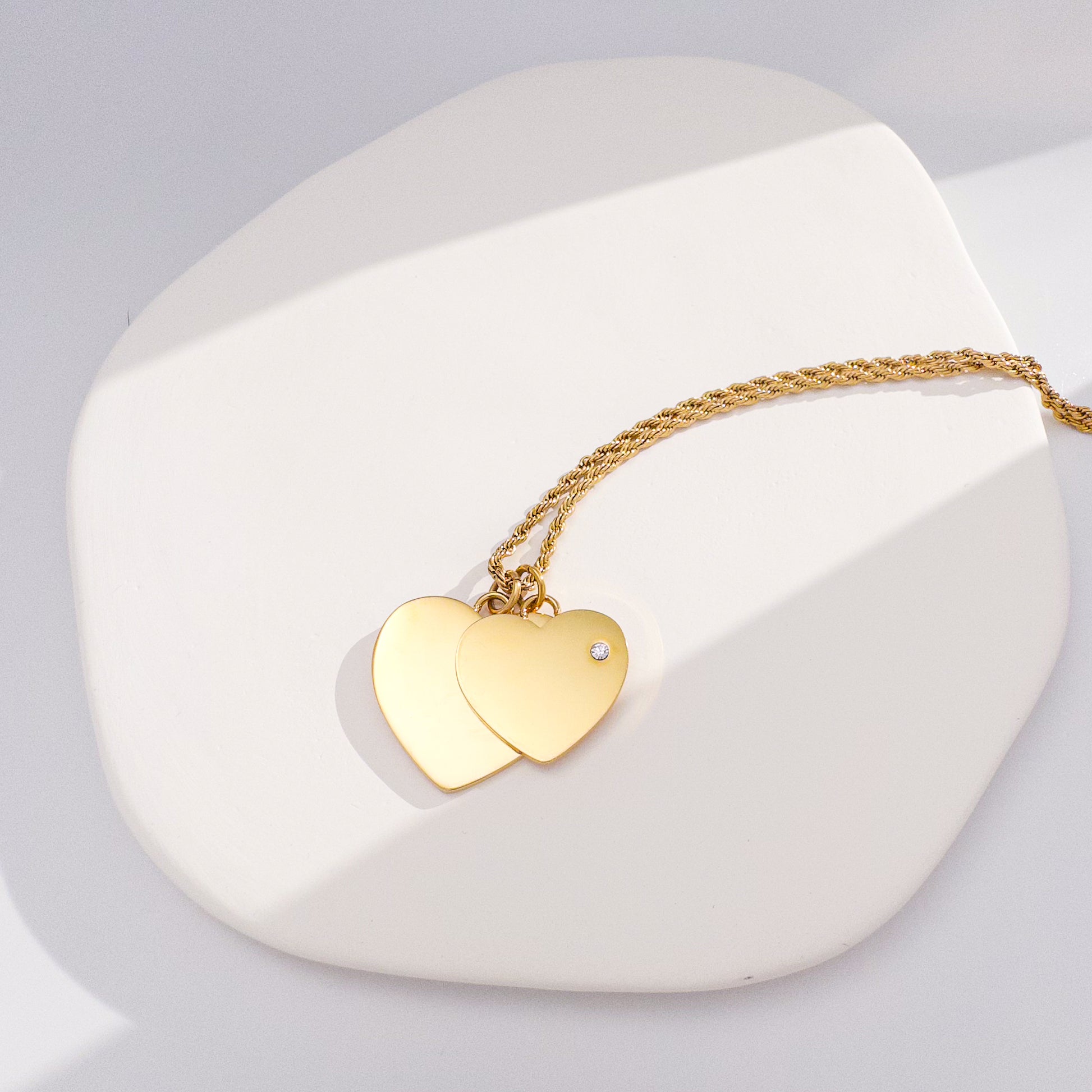This charming necklace features two gold-toned heart pendants, one adorned with a delicate crystal. The elegant rope chain complements the hearts beautifully, creating a romantic and waterproof accessory perfect for everyday wear or special occasions.