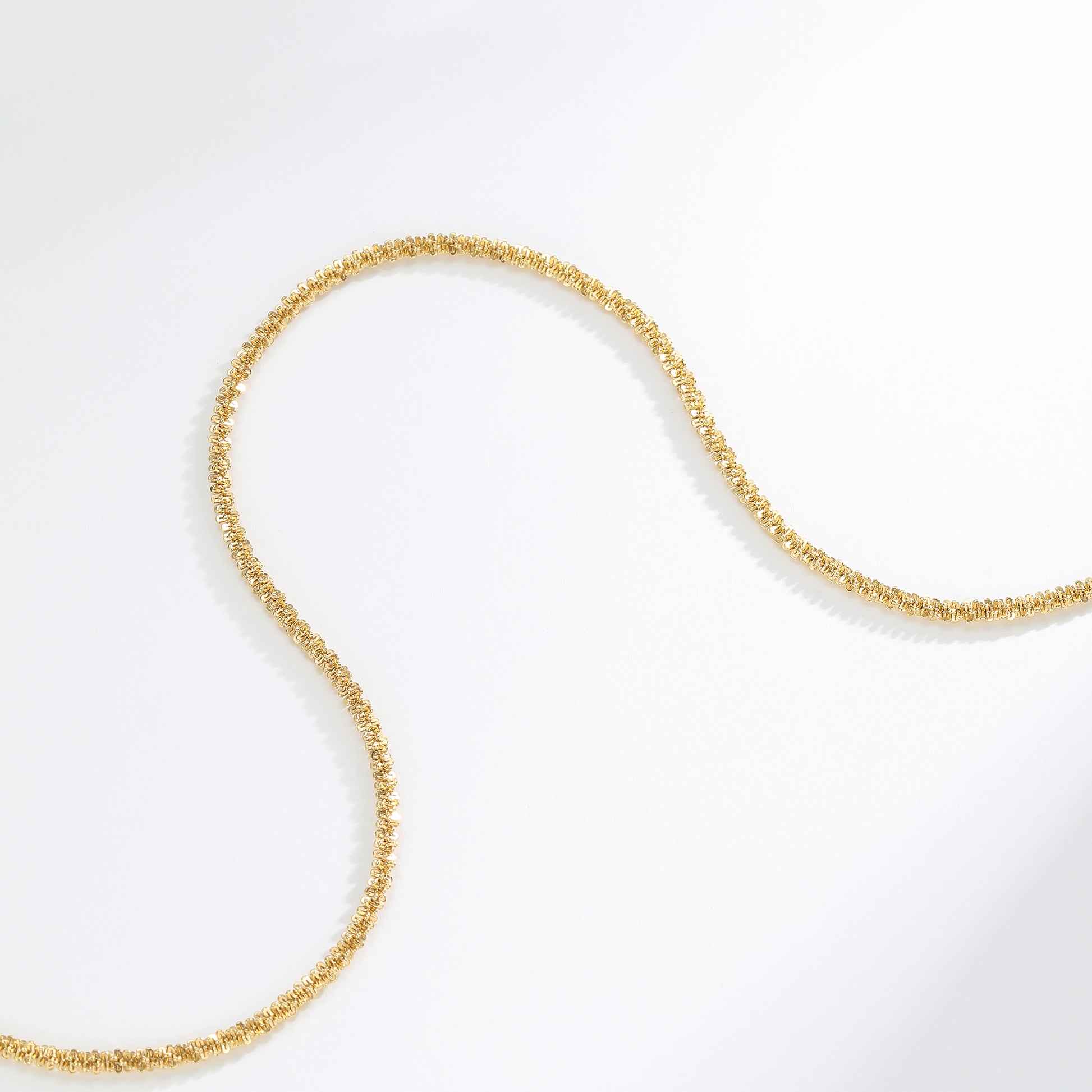This delicate gold-toned necklace features a shimmering twisted chain design. With an adjustable clasp, it offers versatile styling options for any neckline.