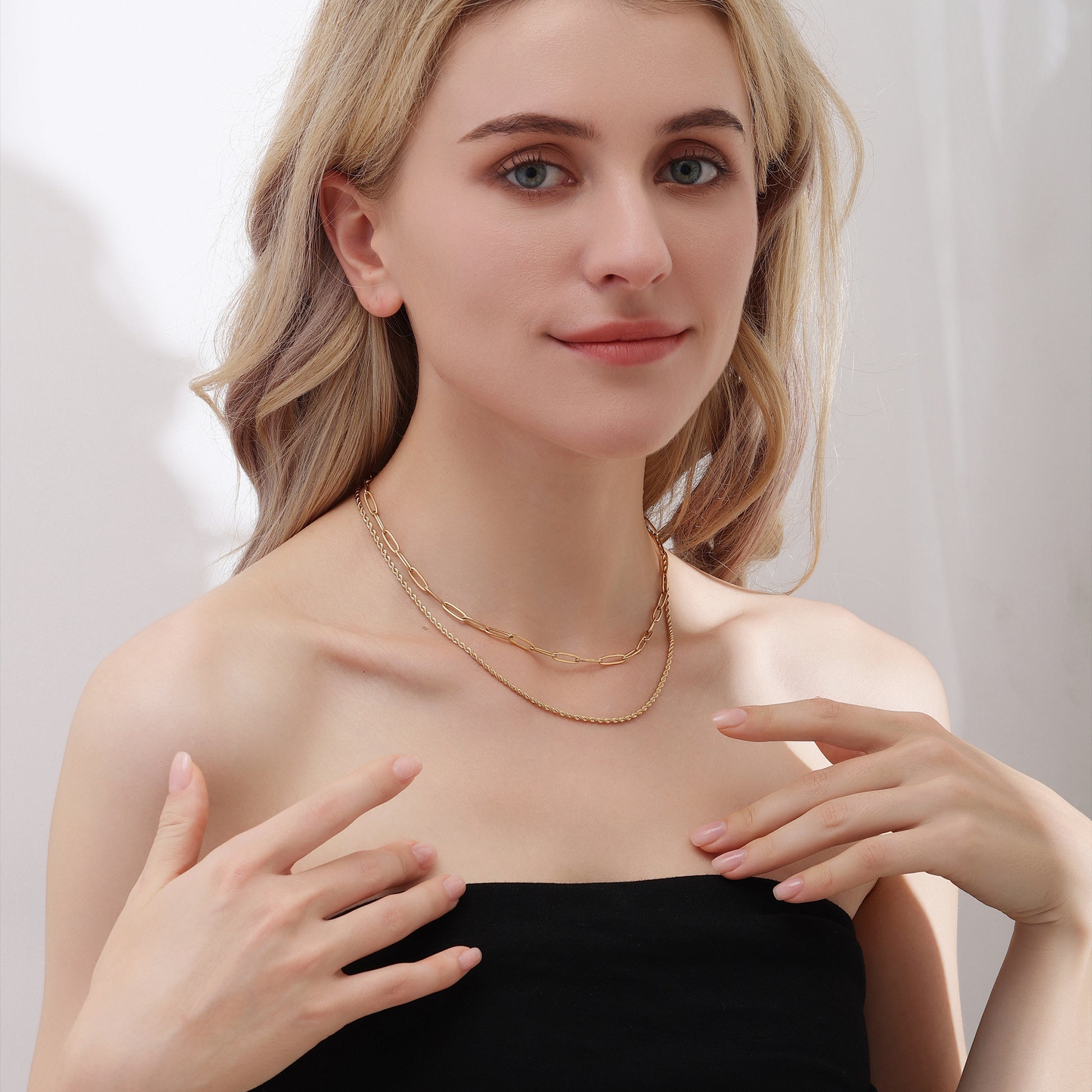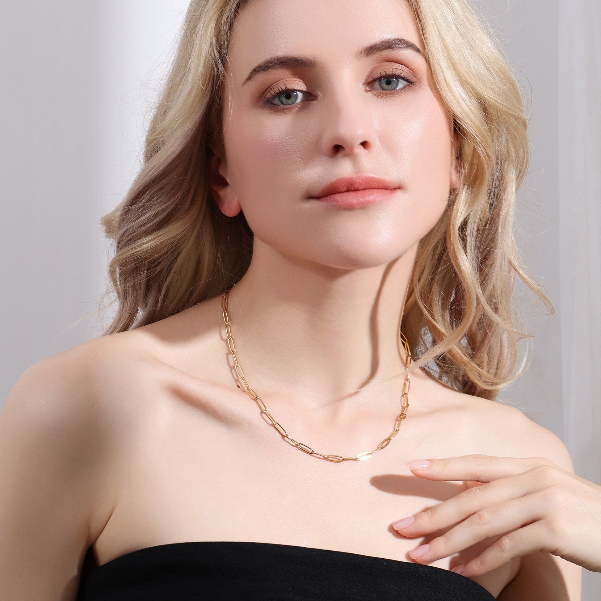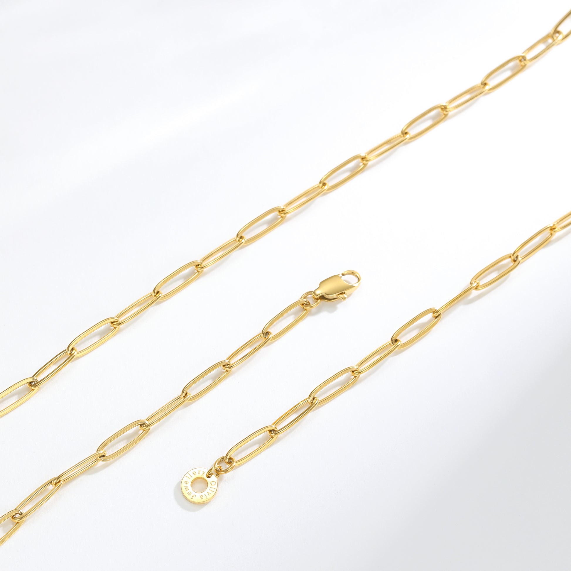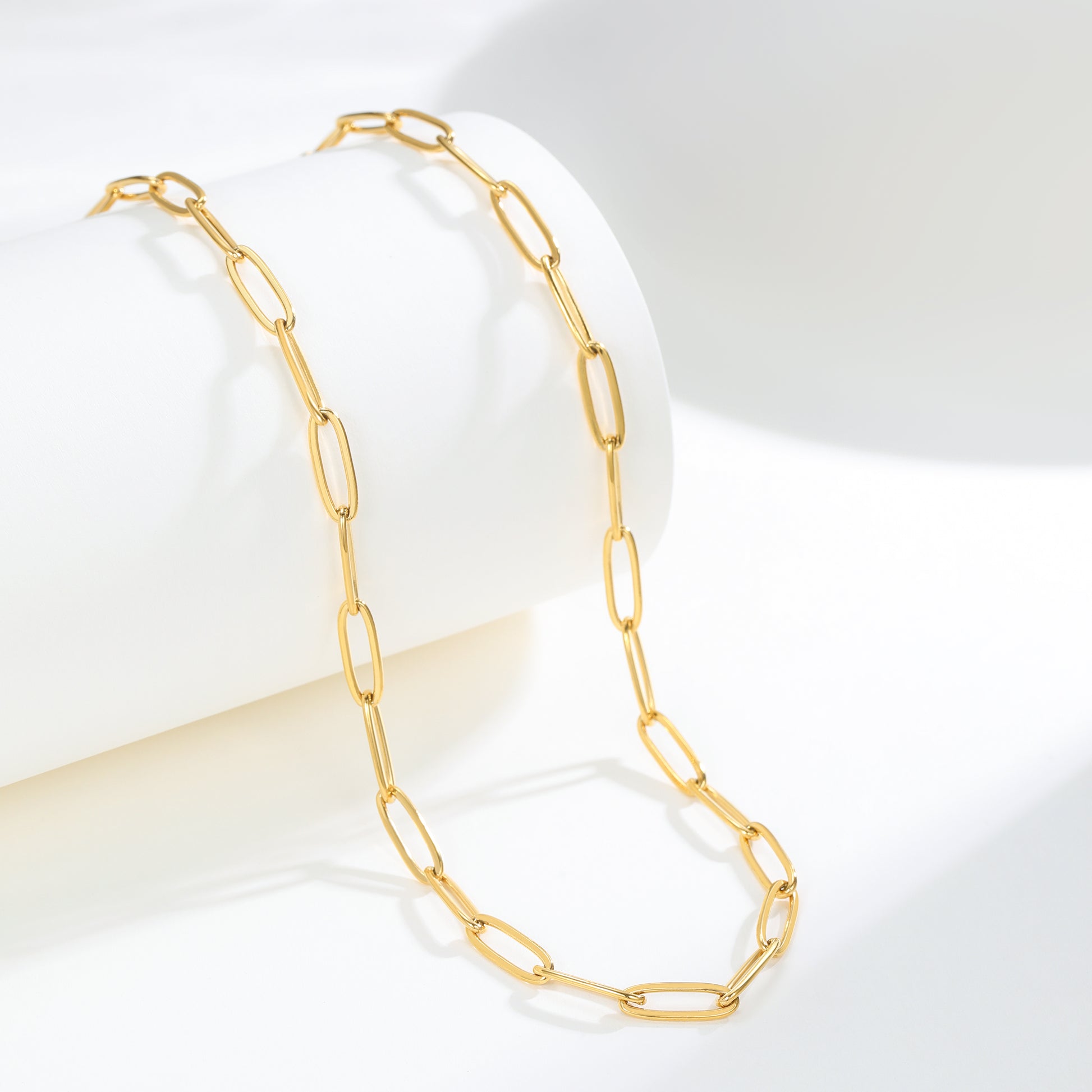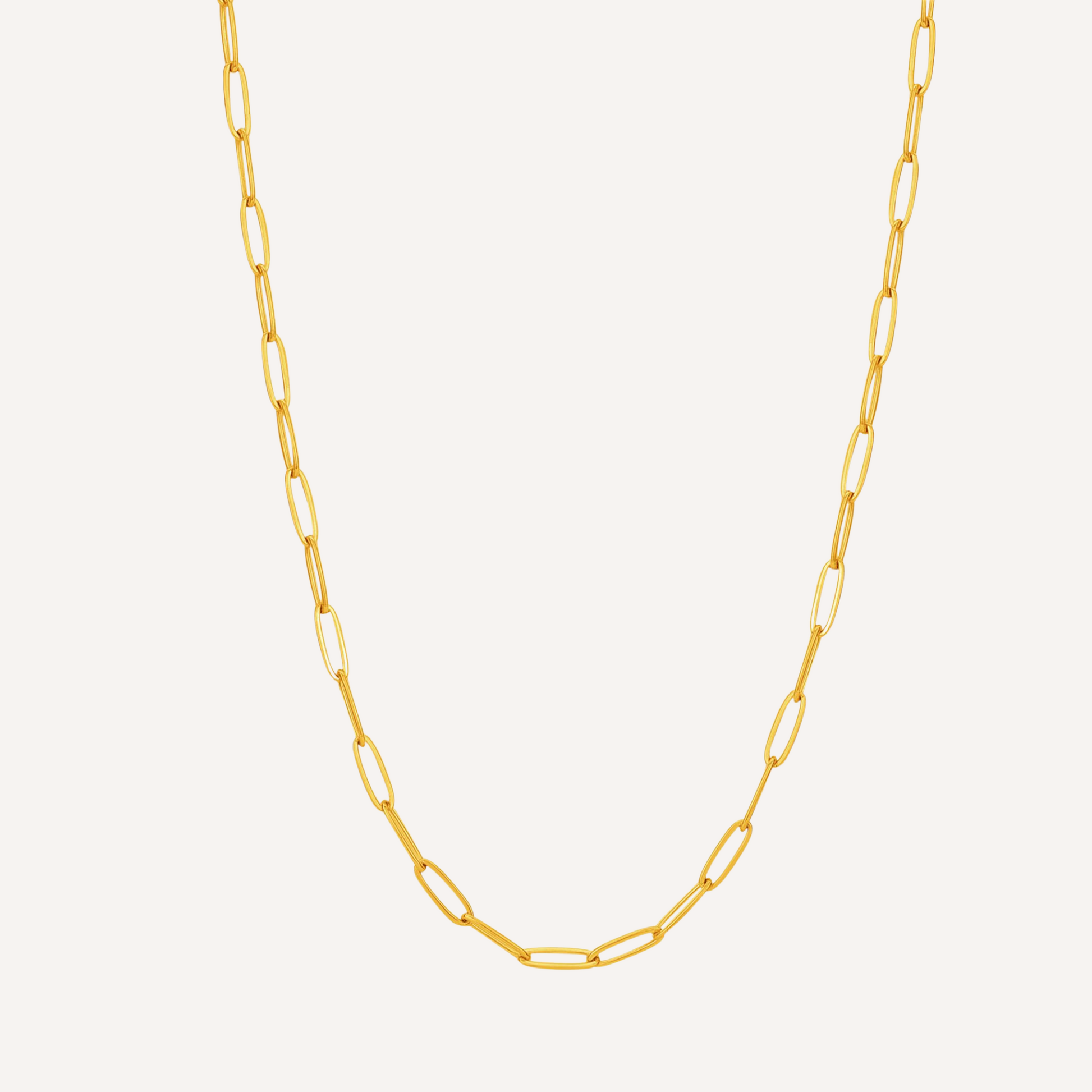 Elevate your everyday look with this sleek gold paperclip chain necklace. Crafted from waterproof materials, it's perfect for beach days or poolside lounging.
