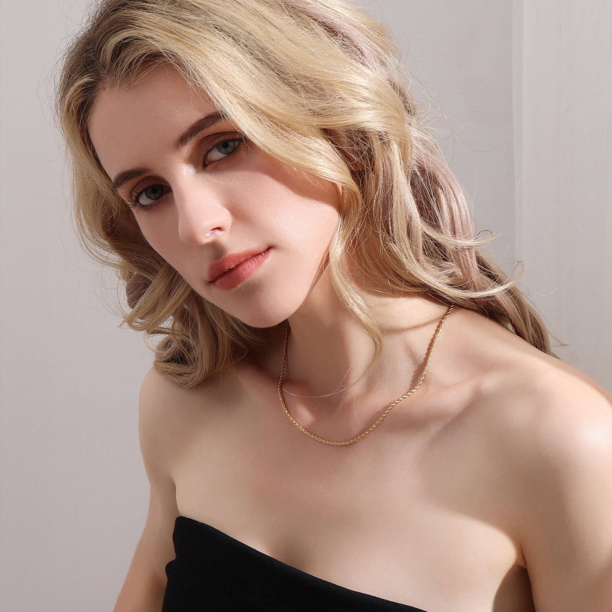 This timeless gold rope chain necklace combines elegance with durability. The twisted design adds texture and catches the light beautifully. Crafted from waterproof materials, it's ideal for active lifestyles and water activities.