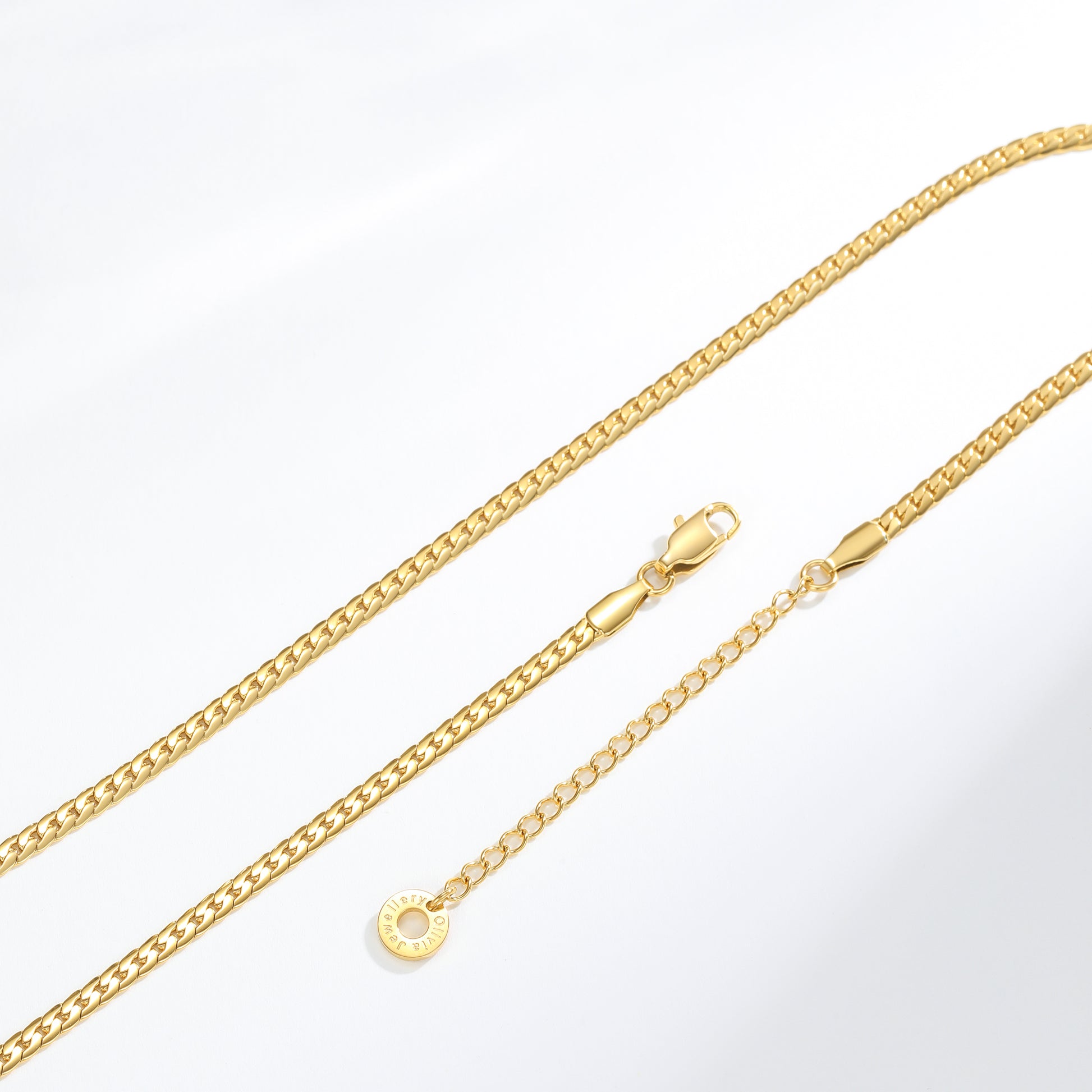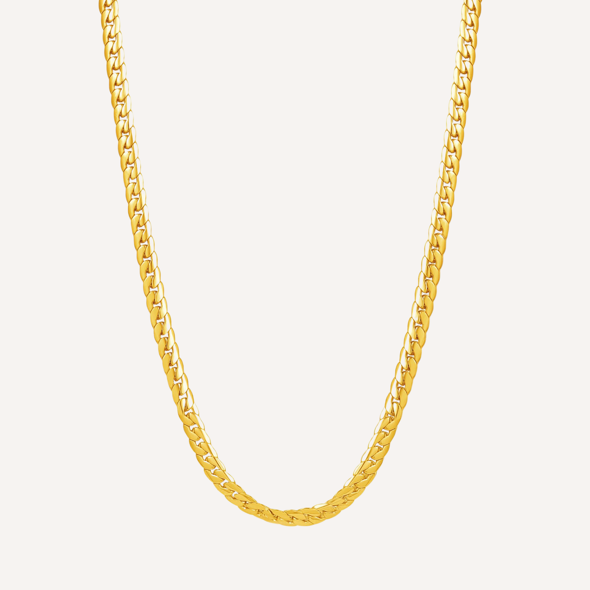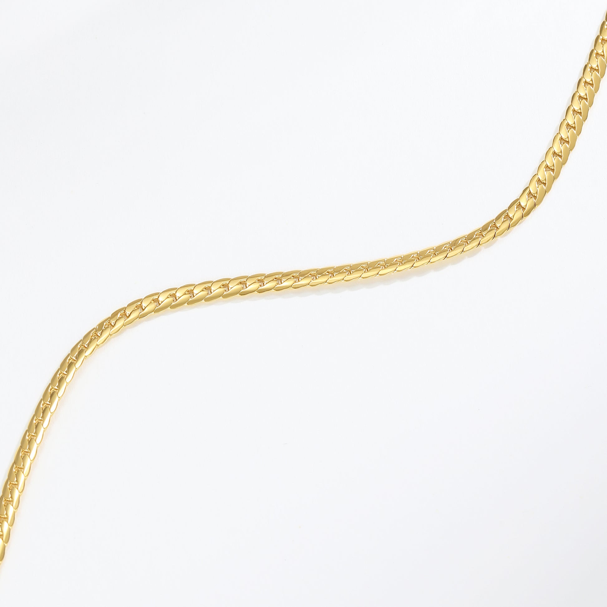 This sleek herringbone chain necklace offers a contemporary twist on classic style. Crafted from waterproof gold-plated material, it features a flat, interlocking pattern that lies smoothly against the skin.