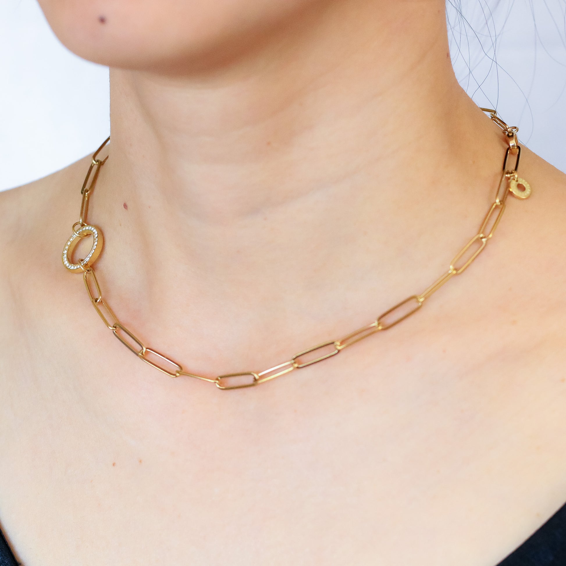 Elevate your everyday style with this modern paperclip chain necklace, featuring a stunning crystal-encrusted ring centerpiece that adds just the right amount of sparkle while maintaining a clean, minimalist aesthetic.