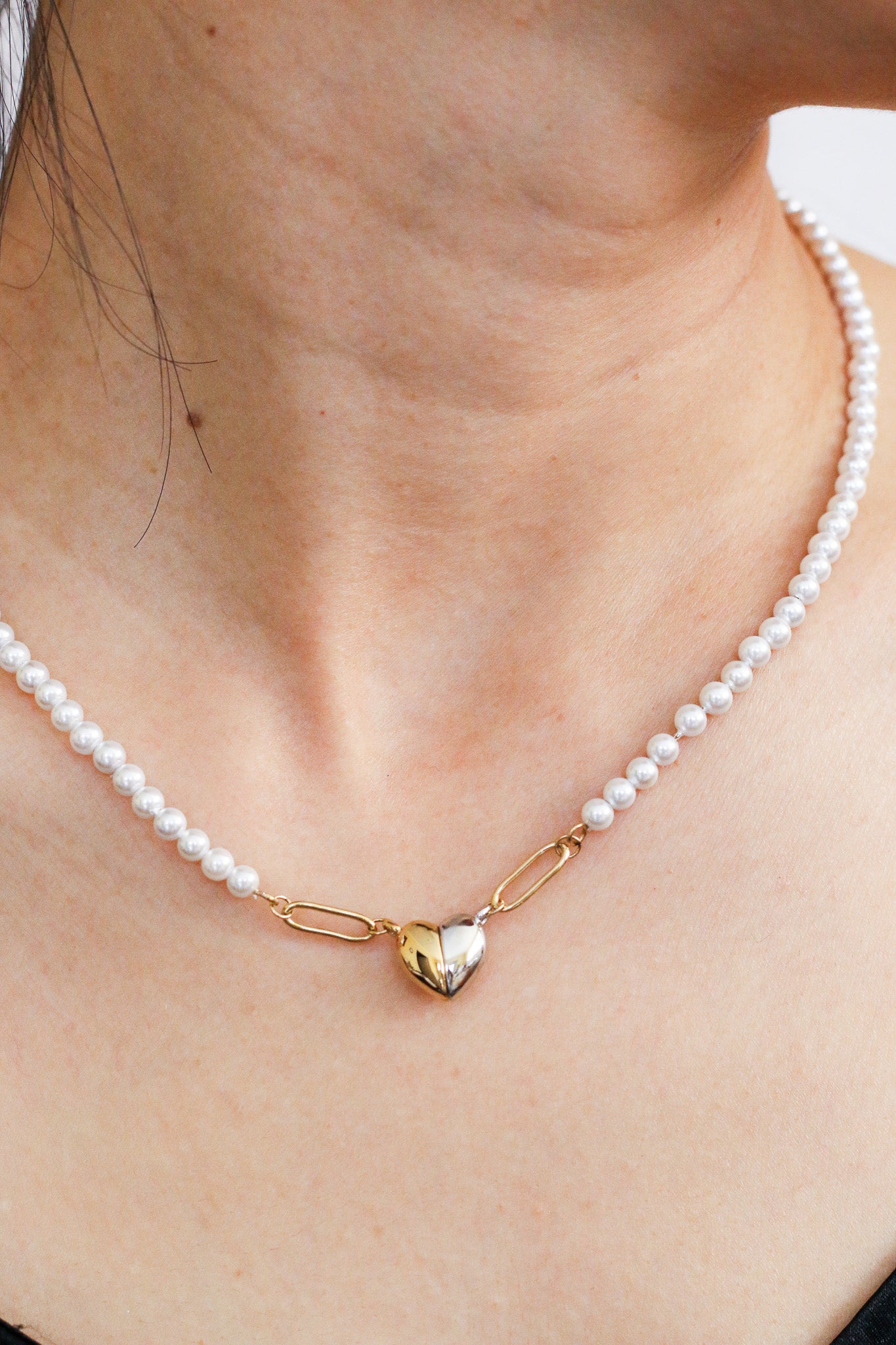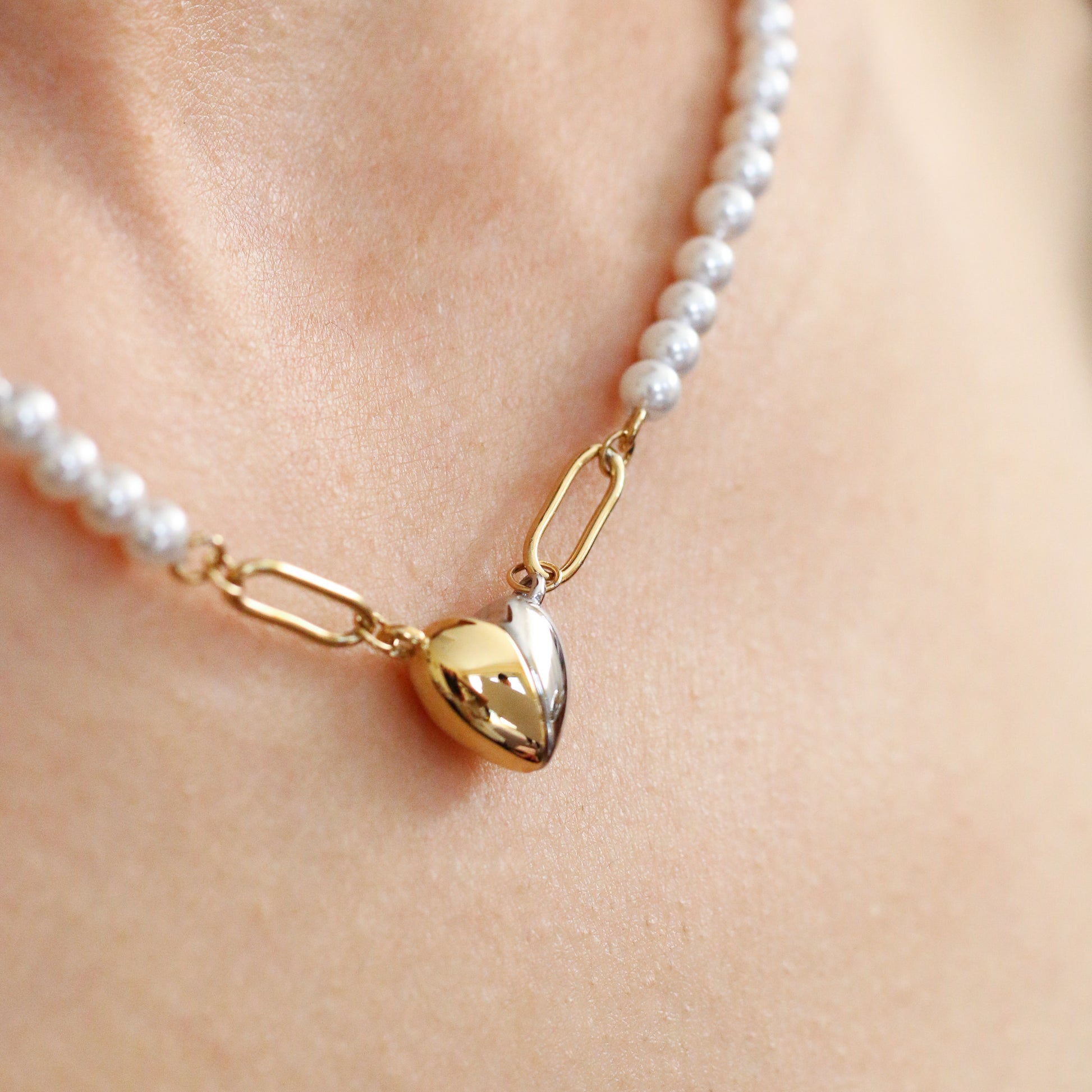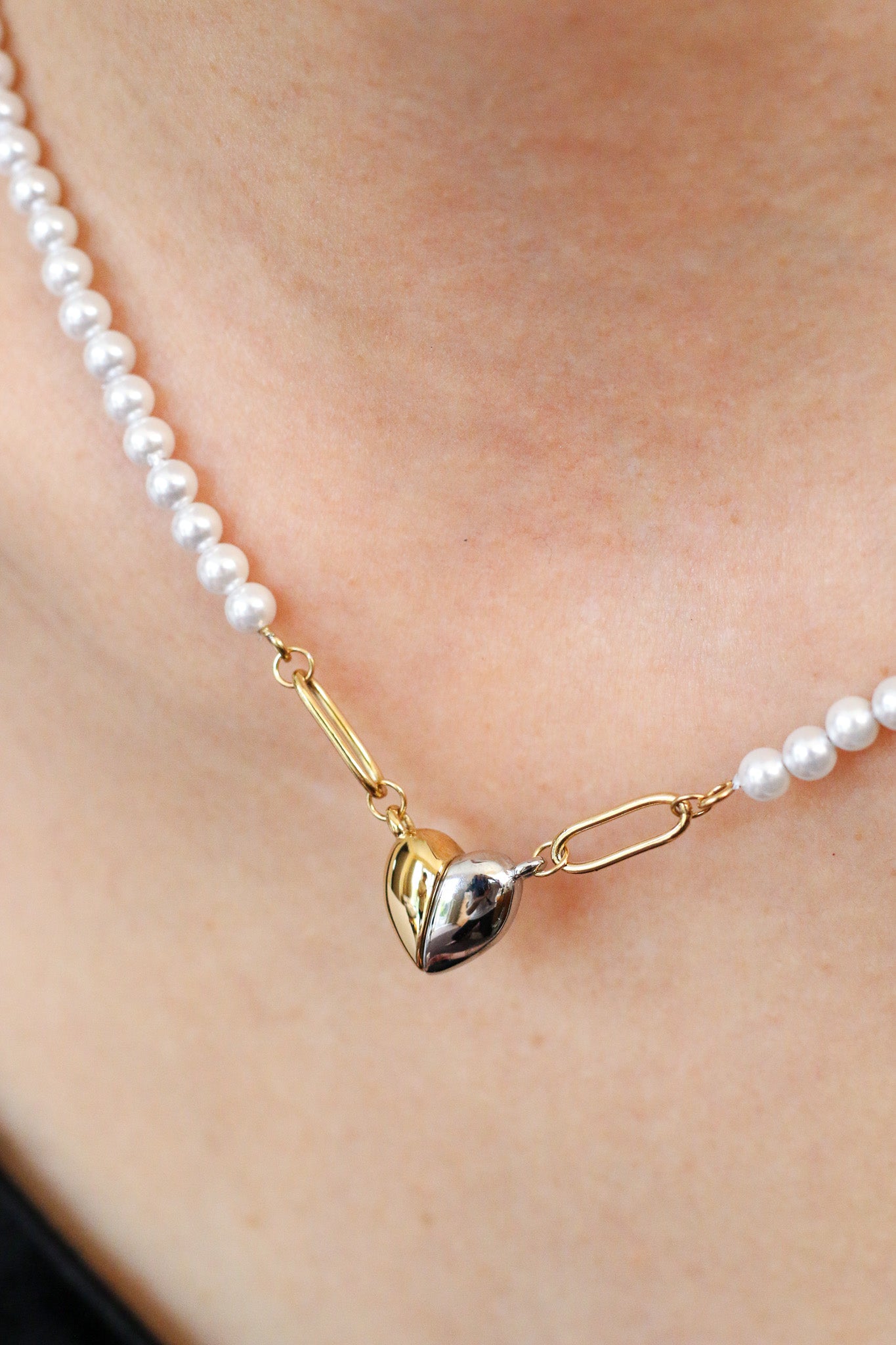 Experience the magic of our two-tone magnetic heart pendant featuring detachable gold and silver halves, elegantly suspended on a classic pearl chain with modern paperclip links - perfect for mixing and matching with both gold and silver jewellery.