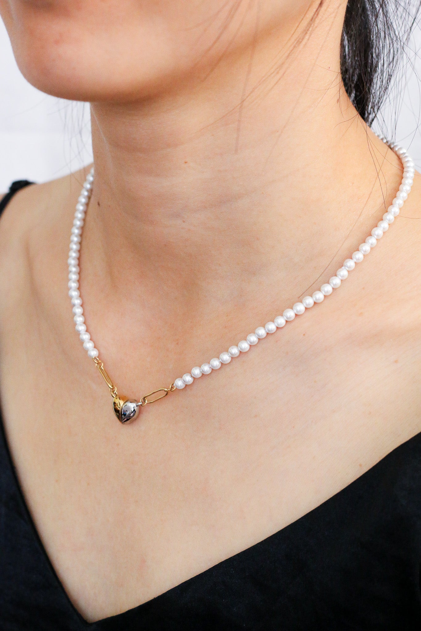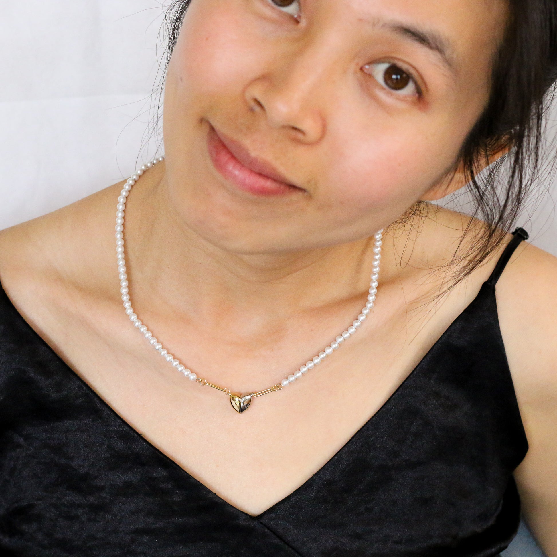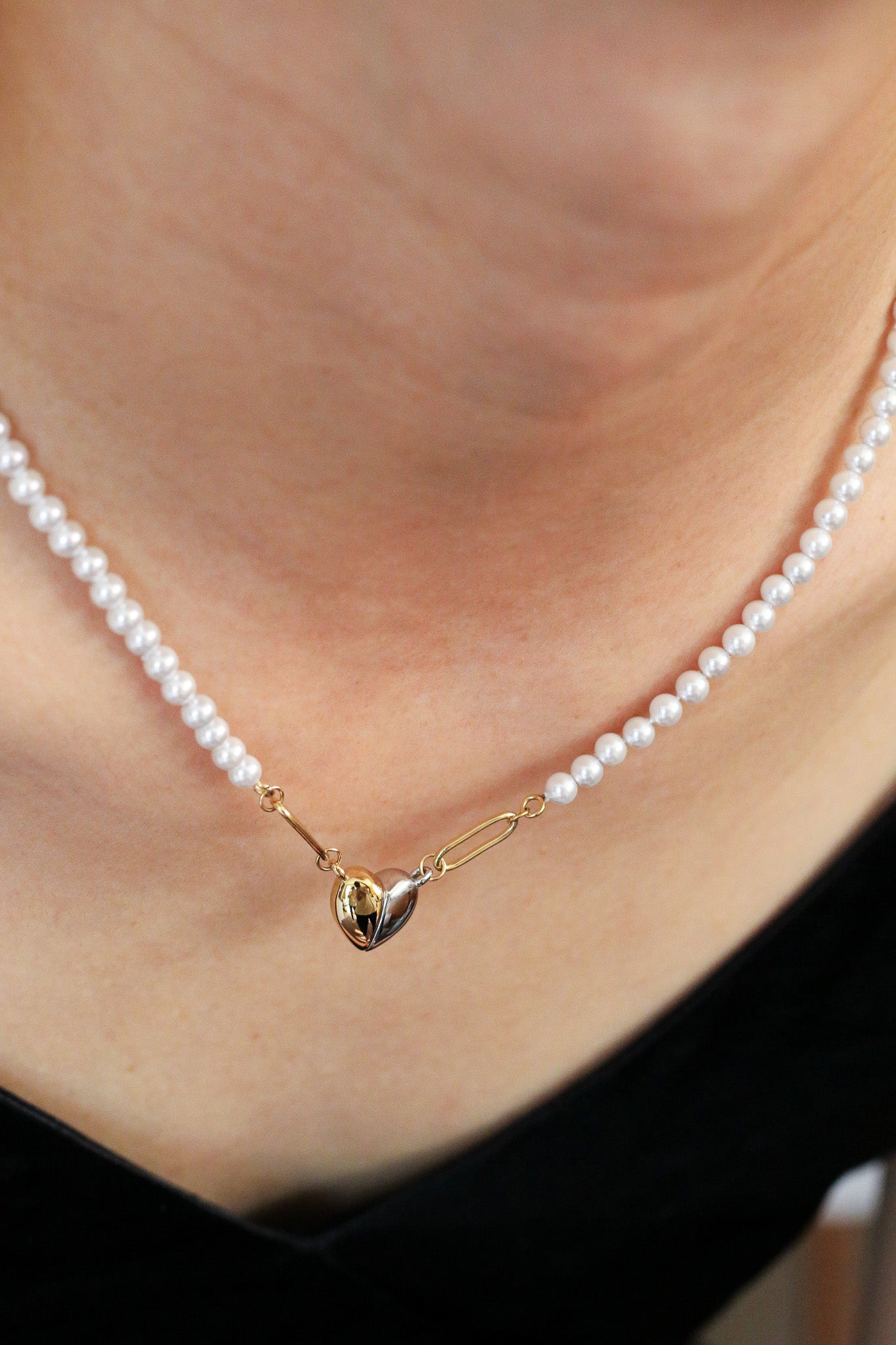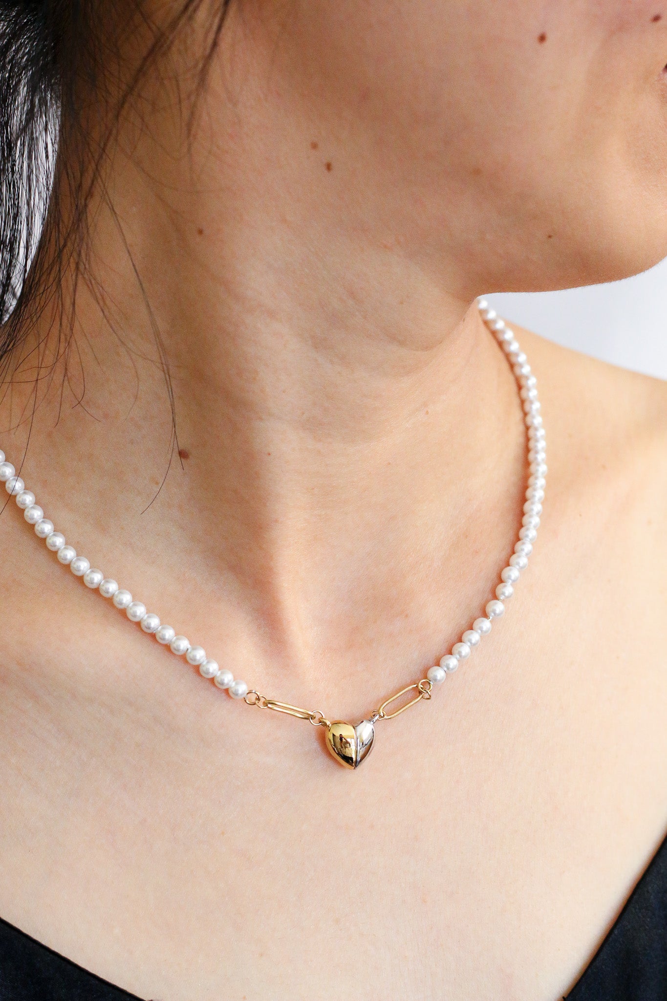 Experience the magic of our two-tone magnetic heart pendant featuring detachable gold and silver halves, elegantly suspended on a classic pearl chain with modern paperclip links - perfect for mixing and matching with both gold and silver jewellery.